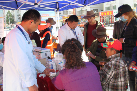 义诊活动现场,医疗队耐心的向每一位前来问诊的居民询问病史、分析病情、发放药品,并细心的向居民介绍药品的使用注意事项。活动持续了一上午,累计接诊患者200余人,发放健康宣教手册60余份,免费发放药品6000余元。