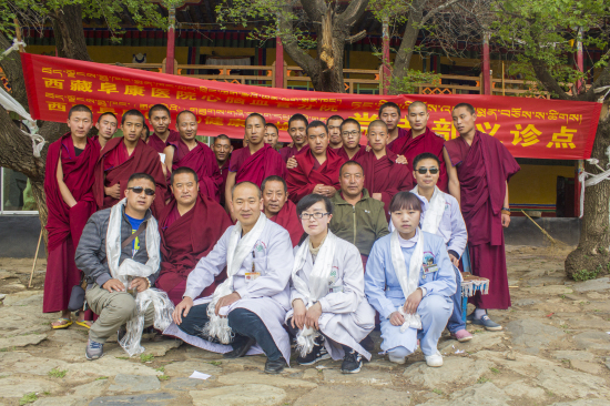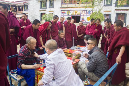 义诊现场,医疗队热情接待每一位前来就诊或咨询的僧侣,为其看病、发放药品及讲解日常健康知识和自我保健的方法,僧侣们也由一开始的只是驻足观望转为积极上前就诊,并主动向医疗队阐述自己的病状,同时针灸科李泉涛医生更是不间断地为多位经常久坐寺中的僧侣推拿与按摩颈、肩、腰、腿等各个部位。中午时分,医疗队还受邀与僧侣们一起吃斋饭。