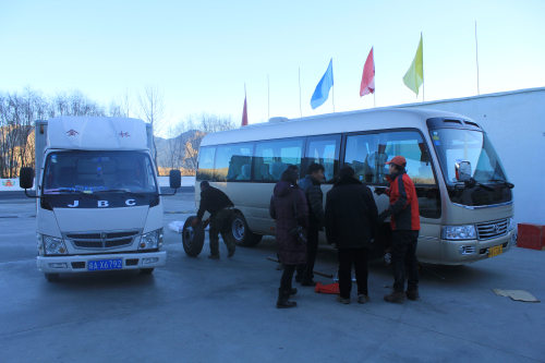 19日清晨7时,满载物资的货车本应准时从拉萨市出发,前往日喀则目的地,但刚准备出发,我们的货车却因天气寒冷,在香格里拉酒店的坡道上熄火。天气太冷,发动机打不着火,这可急坏了大家伙,当下,大家纷纷下车,一起推车。所幸,最终货车重新启动!可在汽车行驶至拉萨机场附近时,我们的客车又被利物刺破了前轮,并且由于天色尚早,附近的几处修理厂皆是大门紧闭,尚未开门,好在加油站的工作人员替我们打了电话,找来了一位修车师傅!