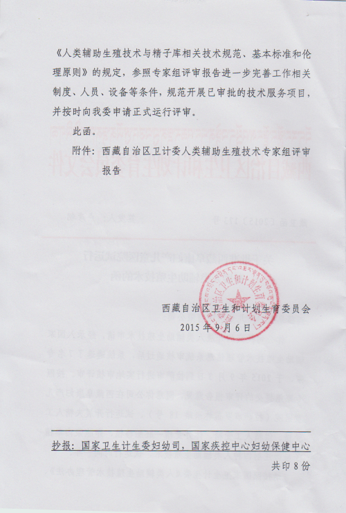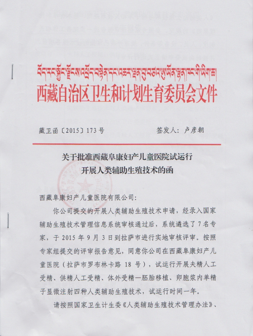你公司提交的开展人类辅助生殖技术申请,经录入国家辅助生殖技术管理信息审核通过后,系统遴选了7名专家,于2015年9月3日到拉萨市进行实地审核评审。按照专家组提交的评审报告意见,同意你公司在西藏阜康妇产儿童医院(拉萨市罗布林卡路18号),试运行开展精子人工受精、供精人工受精、体外受精-胚胎移植、卵胞浆内单精子显微注射四种人类辅助生殖技术,试运行时间一年。