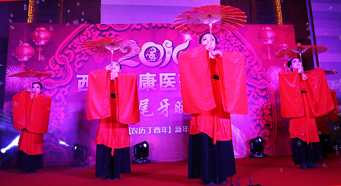 随后阜康医药年终尾牙晚会正式开始,优雅古典的《礼之舞》、幽默诙谐的《碰瓷》、欢快的《青春踢踏》、令人警醒的《手机综合症》、活泼性感的《百老汇》伴随着激动的百元红包、希诺水杯、微波炉、ipad抽奖活动一次次把晚会推向高潮。