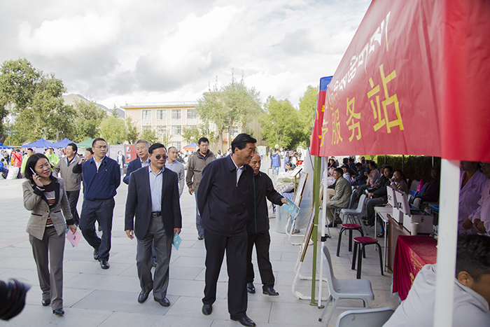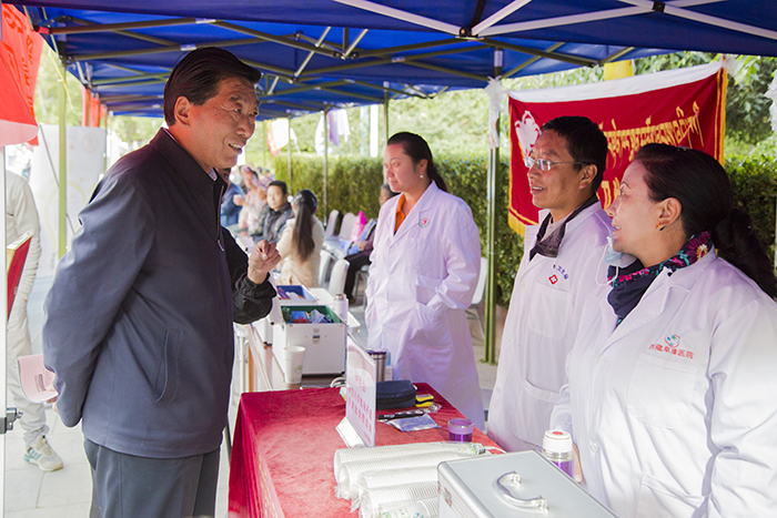 西藏自治区人大常委会副主任、西藏大学党委书记尼玛次仁,西藏大学党委委员、副校长白玛次仁,西藏大学党委委员、副校长张兴堂及西藏大学各学院院长等领导在新生入学巡查工作中,于阜康医院义诊点与我院义诊人员进行了交流,表示校区定会全力配合与支持我院的义诊工作,并再三对我院义诊队表达了诚挚的感谢。
