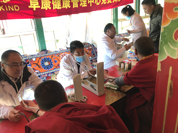 随后,义诊活动井然有序地开始了,张院长和田丰辉医生负责测血压,护士唐宗青测血糖,琼玛负责发放药品,占堆(我院体检中心医务人员)对每一位血压、血糖高的僧人、群众进行登记,有利于以后对他们的健康进行随访跟踪,了解他们有无不适以及血压、血糖情况,督促他们的按时服药、并指导他们健康的生活方式。在义诊体检过程中,一名76岁的老人,血压200/120mmHg,经过询问,老人身体并没有不适,在详细的给老人讲解了高血压对身体健康的影响,以及高血压带来的危害后,并给予老人免费发了治疗高血压的药物,嘱咐他这几天要每天规律服用降压药物、监测血压,直至血压在正常范围后可以改为三到五天测一次血压,但降血压药物不能停止,老人欣然接受意见,并握手致谢。
