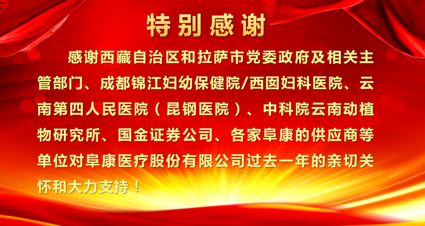 我之存在,因为有你;百年阜康,感恩有您。感恩是一种态度、一种美德、一种情怀!不忘初心、砥砺前行,感谢你们的一路陪伴,阜康的辉煌离不开每一位阜康人的奉献,雄关漫道真如铁,而今迈步重头越!2018年将是阜康腾飞的一年,在各级领导关心下,各位同仁支持下,阜康一年更比一年好!以十九大精神为指导,努力打造“团结、创新、规范、节约、用心”五位一体的现代化医院!为西藏人民群众解决看病远、看病难、看病贵的问题,全心全意为西藏人民健康服务!