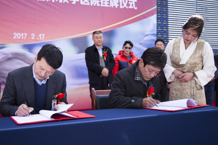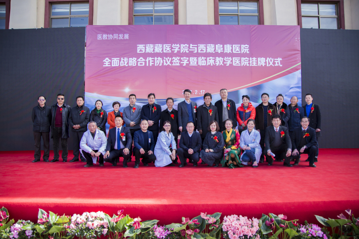 仪式中,西藏藏医学院院长尼玛次仁教授与西藏阜康医药发展有限公司董事长王斌先生首先代表各自单位在“西藏藏医学院与西藏阜康医院全面战略合作协议”上签字,并在签字后与西藏自治区卫生计生委副主任扎西顿珠、拉萨市卫生局党组书记冯毓强两位领导共同为“西藏藏医学院临床教学医院”揭牌;在现场各位领导、来宾、同仁及各新闻媒体的共同见证下,西藏藏医学院与西藏阜康医院全面战略合作协议正式签字生效、西藏藏医学院临床教学医院正式挂牌成立!