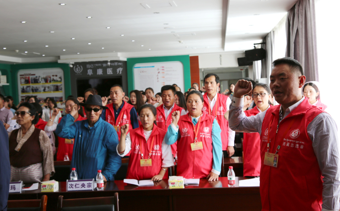 8月7日下午,西藏阜康医疗股份有限公司举办了阜康雪域天使志愿者服务队活动启动仪式暨首轮培训大会,参加本次会议的有西藏志愿联合服务会副秘书长、3名阜康公司行风监督员(西藏自治区工商联非公党工委办公室副主任郭海亮、那曲金沙公司副经理次仁央宗、西藏卓玛爱心家园实业有限公司董事长卓玛),“阜康雪域天使志愿者服务队”队长王斌以及阜康医院院领导、全体志愿者。会议由阜康雪域天使志愿者服务队副队长陈彬主持。