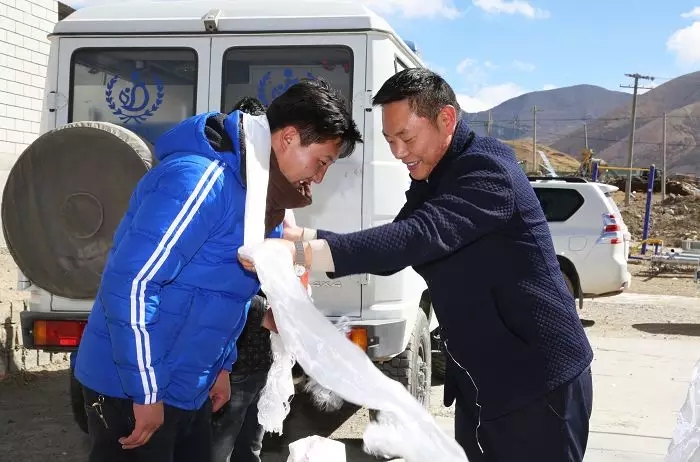 公司党委副书记、副总经理陈彬为嘉黎县夏玛乡一村村民献上哈达