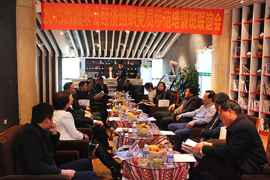 2016年3月25日及3月27日下午,拉萨知名会所企业座谈会及2015西藏非公经济组织党员示范培训班联谊会先后在西藏阜康(国际)健康体检中心咖啡厅举行。拉萨各知名会所企业代表、2015西藏非公经济组织党员示范培训班成员:西藏阜康医药发展有限公司总经理、党委纪检委员陈彬,西藏阜康医药发展有限公司党支部青年委员、董秘李霞,西藏雅喜实业公司党支部副书记、董秘雷满兴,拉萨远大建材有限公司支部副书记周西平,拉萨市城关区亿鑫废旧回收有限公司党支部书记李晓飞,江苏商会常务理事梁钜松,拉萨市申新商贸有限公司董事长赵万才,星宇通讯器材有限公司党支部书记王金刚,西藏华钰矿业集团党委副书记刘志峰,西藏浙江商会党支部书记陈炬亦,西藏盖天力机械有限公司总经理王东胜,西藏百益大酒店总经理、法人代表曹光亮,拉萨鼎业制粉有限公司副总经理郭倩,西藏泰成餐饮有限公司党支部负责人孙宏霞,西藏易境旅游景观设计有限公司党支部书记李川及我院扎西顿珠副院长,敖德秀副院长、党委专职副书记,张治副院长,各医院办公室主任等先后参加了两次会议。