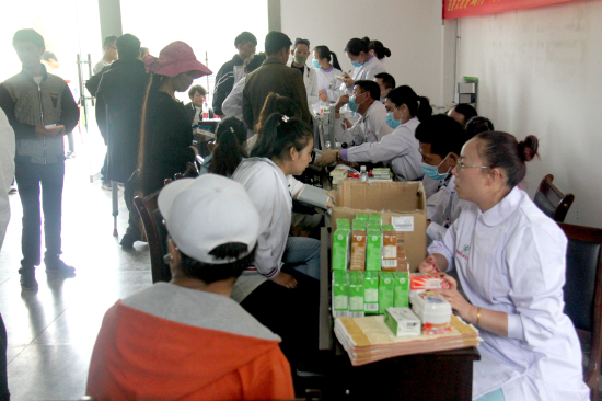 义诊活动刚开始,义诊台就被围个水泄不通,此外,党支部的医务人员们为等候检查的残疾人发放有爱心早餐及日常用品等。义诊过程中,医务人员分工协作,井然有序地为前来义诊的残疾人量血压、测血糖、听心率等,同时认真问询并听取他们讲述自己的病症,为一些需要服药的残疾人开具处方和免费发放药品,并一一介绍药品的服用方法、剂量等,也为一些长期服药的残疾人调整了治疗方案,更耐心提醒他们要注意养成健康的生活方式,向他们宣传健康保健知识。